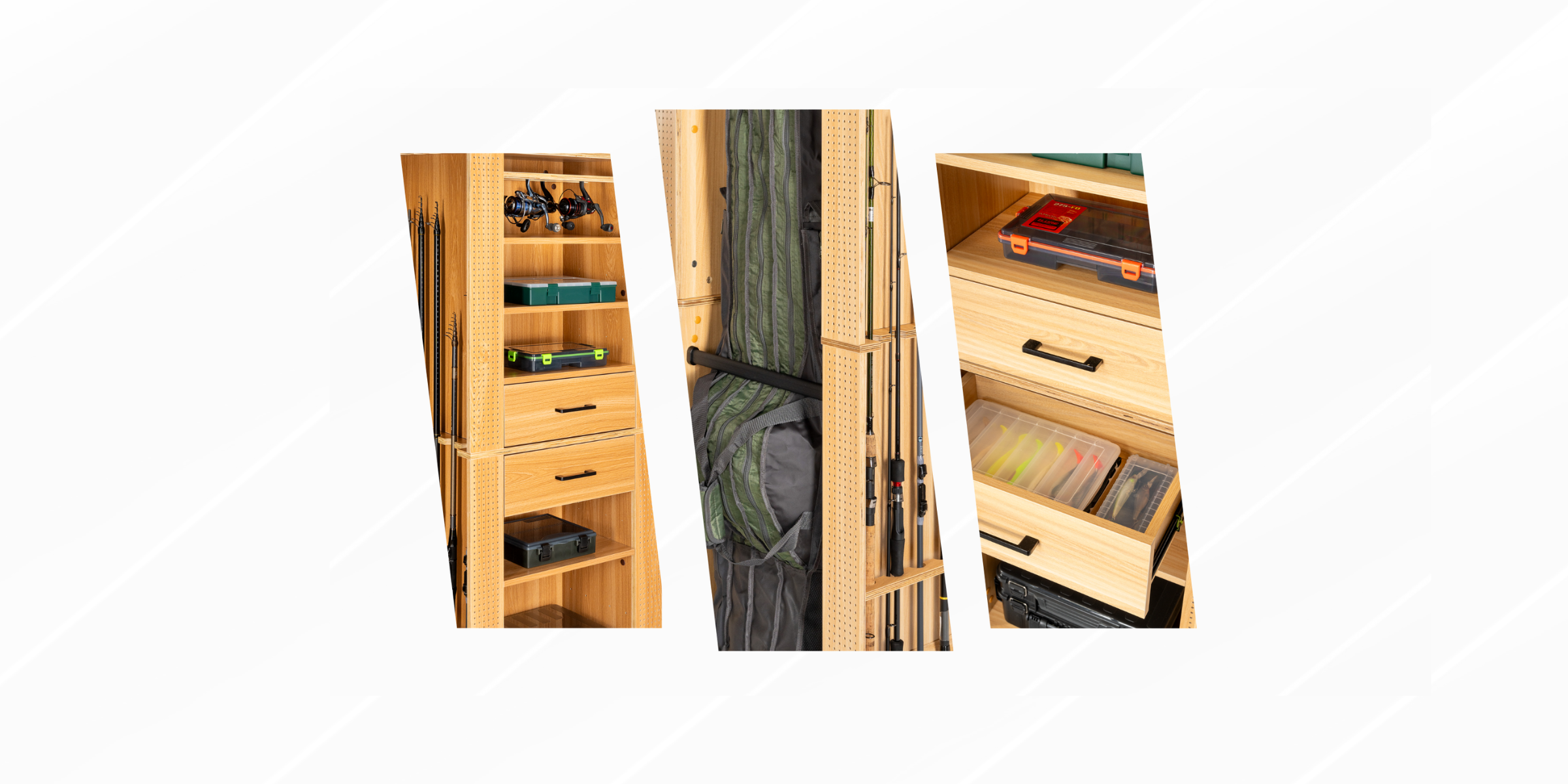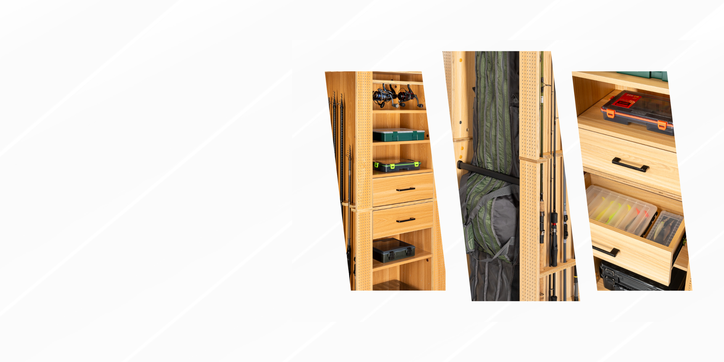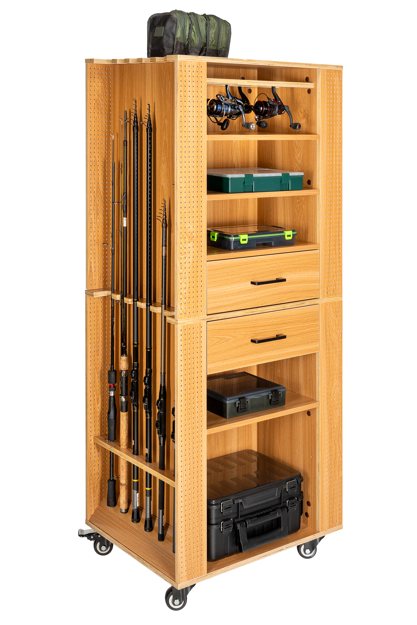 - Drawers, shelves and fishing reel holders can be ordered separately