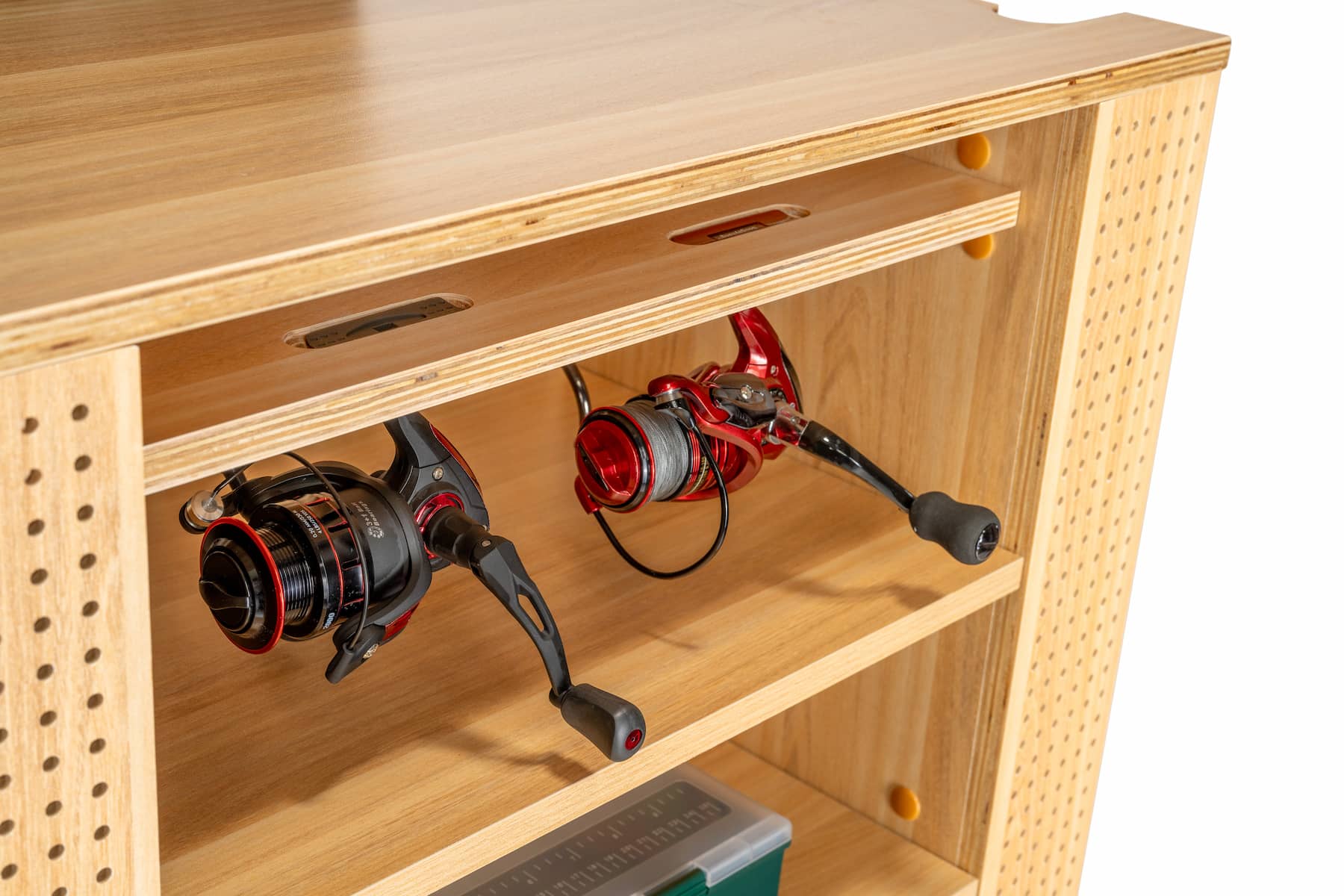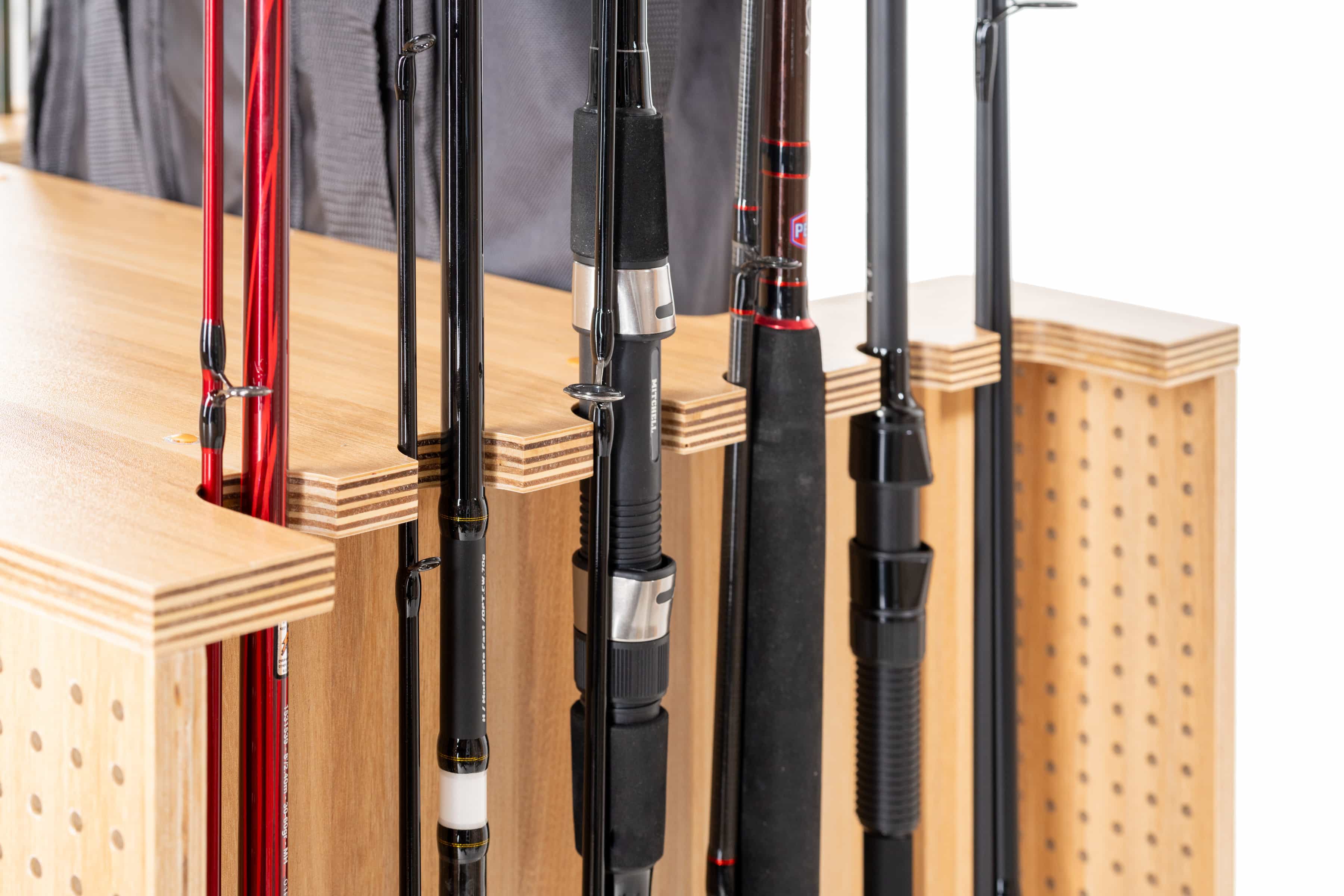 - Additional fishing accessories can be hung using pegboard hooks.