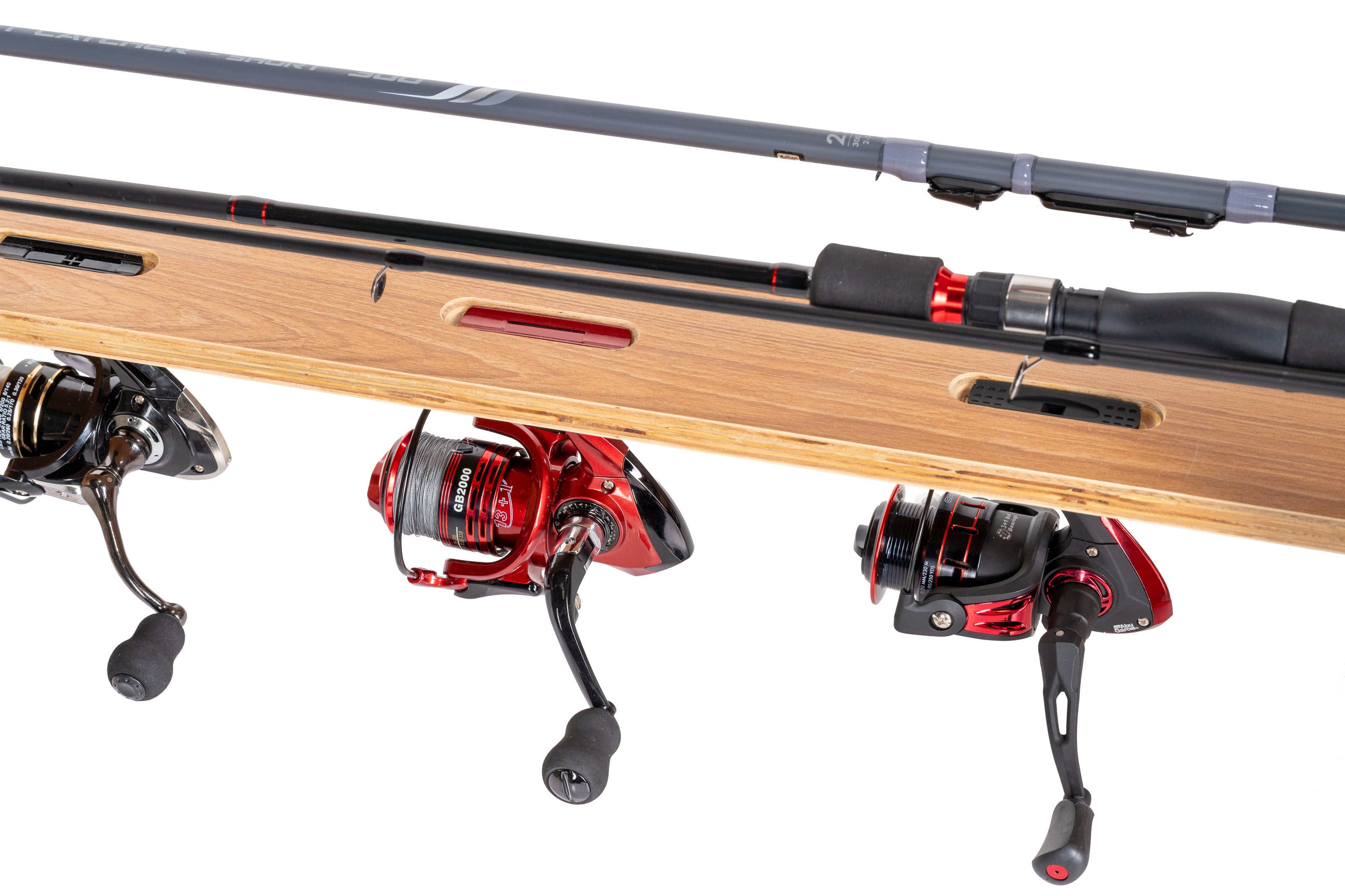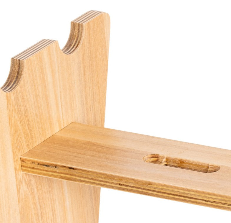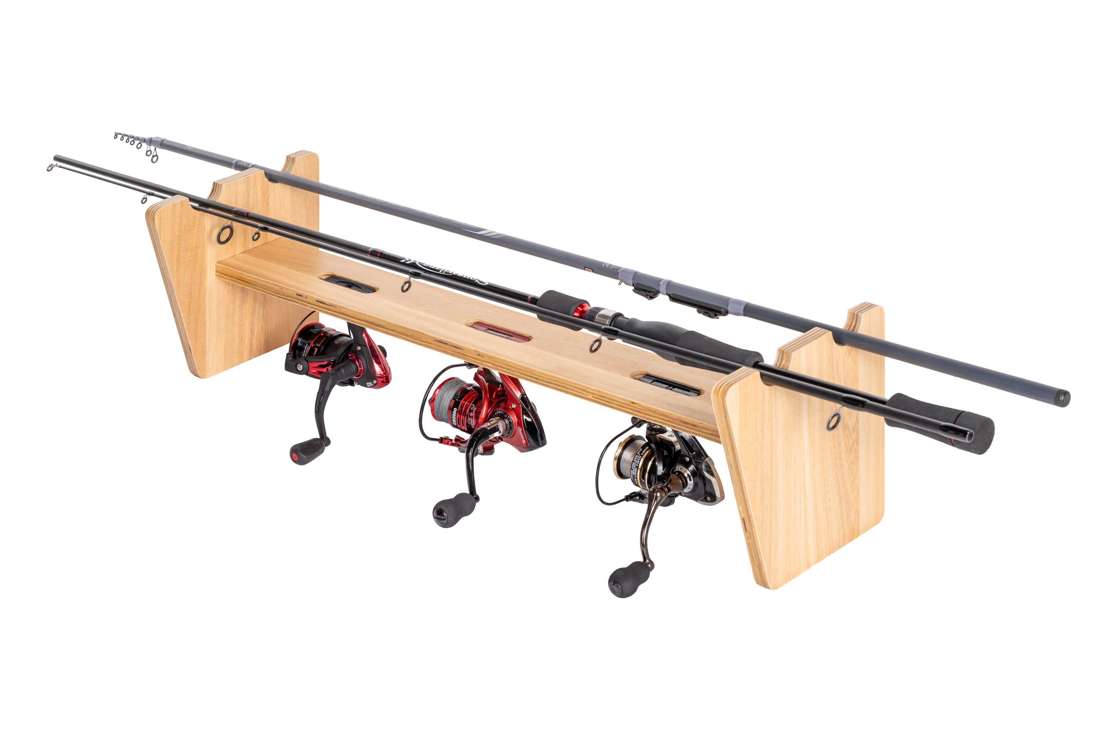 Our precisely crafted fishing rod rack offers a professional storage solution for up to three fishing reels and two fishing rods . The construction is based on high-quality, FSC-certified multi-layer wood , ensuring maximum dimensional stability and durability – ideal for demanding use by hobbyists or professionals.